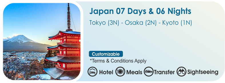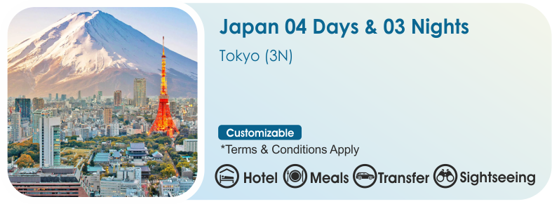 Japan 04 Days & 03 Nights (Tokyo 3N) Tour Highlights : Transfer From Tokyo Airport to Hotel. Tokyo City Tour. Mount Fuji Tour. Transfer from Hotel to...
